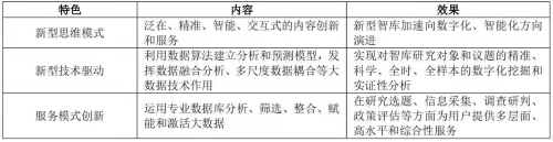 為了適應(yīng)數(shù)字時(shí)代的迅速發(fā)展,智庫也在積極進(jìn)行數(shù)字化轉(zhuǎn)型。相對傳統(tǒng)智庫而言,數(shù)字智庫在思維模式創(chuàng)新、新型技術(shù)驅(qū)動(dòng)、服務(wù)模式創(chuàng)新方面具有優(yōu)勢與特色,見表1。