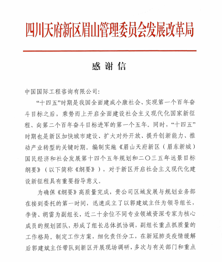 近日,中咨公司收到天府新區(qū)眉山管委會發(fā)展改革局寄來的熱情洋溢的感謝信,感謝中咨公司長期以來的關心和支持,特別感謝區(qū)域發(fā)展與規(guī)劃業(yè)務部審時度勢、創(chuàng)新思維、高質量完成當?shù)亍笆奈濉币?guī)劃綱要編制工作。