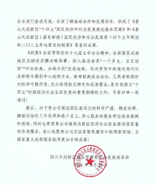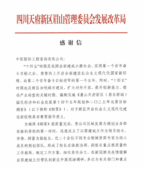 感謝有你:中咨公司服務眉山天府新區(qū)擘畫“十四五”藍圖獲認可