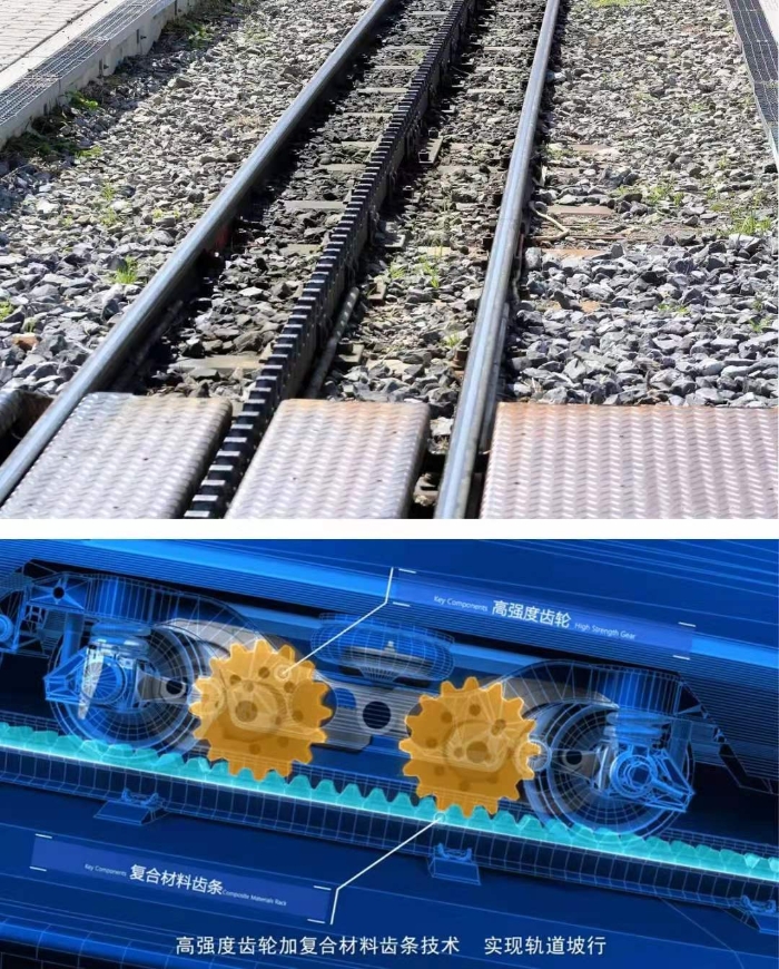 山地軌道交通采用“米軌+齒軌”的制式。在低山地地區(qū),線路縱向爬升小于等于40‰地段,采用輪軌粘著的米軌系統。與準軌鐵路制式的主要差異在于軌距為1000毫米,其他技術幾乎與常規(guī)的準軌鐵路通用;在崎嶇的山地地區(qū),線路縱向爬升坡度大于40‰地段,采用爬坡能力更強的“米軌+齒軌”制式,即在米軌系統的軌枕中間加放一條特制的齒軌,機車同時配備一個或多個齒輪、嚙合行走。