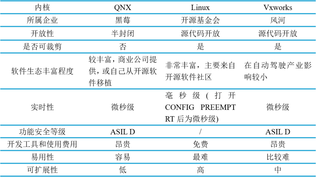 車用操作系統(tǒng)技術(shù)現(xiàn)狀及發(fā)展趨勢 汪志鴻 馬天澤 陳炳全 摘要:隨著汽車向電動化、智能化發(fā)展,其電子電氣架構(gòu)正從傳統(tǒng)分布式架構(gòu)向域集中式架構(gòu)以及中央計算架構(gòu)轉(zhuǎn)變,汽車軟件由面向信號的架構(gòu)朝面向服務(wù)的軟件架構(gòu)升級。車用操作系統(tǒng)是汽車軟件生態(tài)的重要基礎(chǔ),加強車用操作系統(tǒng)技術(shù)研究對保障我國智能汽車產(chǎn)業(yè)安全具有重要意義?;诖吮尘埃疚膶囉貌僮飨到y(tǒng)技術(shù)架構(gòu)、典型產(chǎn)品以及發(fā)展現(xiàn)狀進行了梳理,對比了國內(nèi)外主流虛擬化技術(shù)產(chǎn)品、內(nèi)核、中間件,提出了車用操作系統(tǒng)未來發(fā)展趨勢。 關(guān)鍵詞:車用操作系統(tǒng);內(nèi)核;技術(shù)現(xiàn)狀;發(fā)展趨勢 一、車用操作系統(tǒng)架構(gòu)概述 車用操作系統(tǒng)與芯片、傳感器等物理硬件共同組成車載基礎(chǔ)軟硬件平臺,是實現(xiàn)智能駕駛、智能座艙、安全車控功能的基礎(chǔ)。按上述功能劃分,車載基礎(chǔ)軟件平臺可以分為智能駕駛、智能座艙、安全車控等三個軟件平臺,分別由智能駕駛操作系統(tǒng)、智能座艙操作系統(tǒng)、安全車控操作系統(tǒng)以及相應(yīng)的配套工具鏈組成。 智能駕駛和智能座艙操作系統(tǒng)按架構(gòu)自下而上均可分為系統(tǒng)軟件和功能軟件。其中,系統(tǒng)軟件可以分為硬件抽象層、內(nèi)核和中間件;功能軟件可以分為AI和視覺模塊、傳感器模塊、聯(lián)網(wǎng)模塊、云控模塊、自動駕駛通用框架模塊等。安全車控操作系統(tǒng)是指面向傳統(tǒng)車輛控制,基于OSEK OS(汽車電子開放式系統(tǒng)及接口)和AUTOSAR CP(傳統(tǒng)汽車開放架構(gòu)平臺)構(gòu)建,實現(xiàn)車身、動力、底盤系統(tǒng)等控制功能。車用操作系統(tǒng)架構(gòu)如圖1所示。 圖1 車用操作系統(tǒng)架構(gòu) 車用操作系統(tǒng)中的系統(tǒng)軟件不僅為上層應(yīng)用以及功能的實現(xiàn)提供了高效、穩(wěn)定的環(huán)境支持,也是各類應(yīng)用調(diào)度底層硬件資源的“橋梁”,在智能汽車整體軟件架構(gòu)中處于基石位置。本文將重點介紹系統(tǒng)軟件。 二、系統(tǒng)軟件技術(shù)發(fā)展現(xiàn)狀 系統(tǒng)軟件是針對汽車場景定制的復(fù)雜大規(guī)模嵌入式系統(tǒng)運行環(huán)境,主要包含硬件抽象層、內(nèi)核、中間件三層。 (一)硬件抽象層 1.概念 硬件抽象層是內(nèi)核與硬件之間的接口層,目的是為操作系統(tǒng)提供虛擬硬件平臺,使操作系統(tǒng)與硬件解耦,實現(xiàn)多硬件平臺間的移植。虛擬硬件平臺由虛擬機(簡稱VM)和虛擬機監(jiān)視器(簡稱Hypervisor)構(gòu)成,操作系統(tǒng)在VM上運行,并通過Hypervisor進行調(diào)度。 虛擬機是指通過軟件模擬完整的硬件系統(tǒng)功能,實現(xiàn)操作系統(tǒng)運行在一個完全隔離環(huán)境中。在物理硬件中能夠完成的工作都能夠在虛擬機中實現(xiàn)。 Hypervisor是指一種運行在物理硬件和虛擬機之間的中間層軟件,可以允許多個虛擬機和應(yīng)用共享一套基礎(chǔ)物理硬件,用于協(xié)調(diào)訪問物理設(shè)備和虛擬機,所以又稱為虛擬機監(jiān)視器。Hypervisor主要有兩種,Type 1(裸機類型)和Type 2(寄居類型),Type 1類型的Hypervisor直接運行在物理硬件之上,可直接訪問物理硬件并管理所有硬件資源,在延時、安全性和效率上更勝一籌,但此類型Hypervisor需要硬件支持,移植難度大,開發(fā)成本也較高;Type 2類型的Hypervisor運行在某個操作系統(tǒng)之上,通過操作系統(tǒng)訪問物理硬件,因此在延時方面具有不可避免的劣勢,并且底層操作系統(tǒng)的任何問題都將危及其上的虛擬機,因此安全性方面相對較弱,但是移植難度小,開發(fā)成本低。Type 1和Type 2架構(gòu)如圖2所示。 2.典型虛擬監(jiān)視器 Hypervisor目前主要應(yīng)用于智能座艙操作系統(tǒng),未來將逐步向智能駕駛操作系統(tǒng)擴展。在智能座艙操作系統(tǒng)中,娛樂和智能交互等模塊與儀表顯示等模塊對實時性、安全性、穩(wěn)定性要求不同,需要在一顆SOC芯片上運行兩種或多種操作系統(tǒng)。因此,目前主流Hypervisor方案選擇Type 1型,保障操作系統(tǒng)之間互不干擾,提升操作系統(tǒng)安全性。典型虛擬監(jiān)視器包括QNX Hypervisor、ACRN Hypervisor、Mentor Hypervisor等,均為基于Type 1型的虛擬管理程序。各類Hypervisor對比如表1所示。 3.國內(nèi)外虛擬監(jiān)視器市場格局 近幾年涌入車載Hypervisor領(lǐng)域的企業(yè)非常多,以國外企業(yè)為主,主要產(chǎn)品包括加拿大黑莓公司的QNX Hypervisor、英國XenSource公司的Xen Hypervisor、日本松下旗下子公司的OpenSynergy、Linux基金會的ACRN Hypervisor、美國Mentor Graphics公司Mentor Hypervisor等。其中,QNX Hypervisor是目前唯一應(yīng)用到量產(chǎn)車型且功能安全等級達到ISO 26262 ASIL-D級的虛擬抽象層產(chǎn)品,并支持高通、恩智浦、德州儀器等廠商的芯片。同時,黑莓與博世等多家Tier 1(一級汽車供應(yīng)商)廠商建立了合作伙伴關(guān)系,推廣其Hypervisor產(chǎn)品。此外,高通在Snapdragon Ride自動駕駛軟件堆棧中也選擇了QNX Hypervisor 2.0版本產(chǎn)品。 國內(nèi)Hypervisor發(fā)展相對落后,2017年中科創(chuàng)達、誠邁科技入選黑莓VAI計劃,作為合作伙