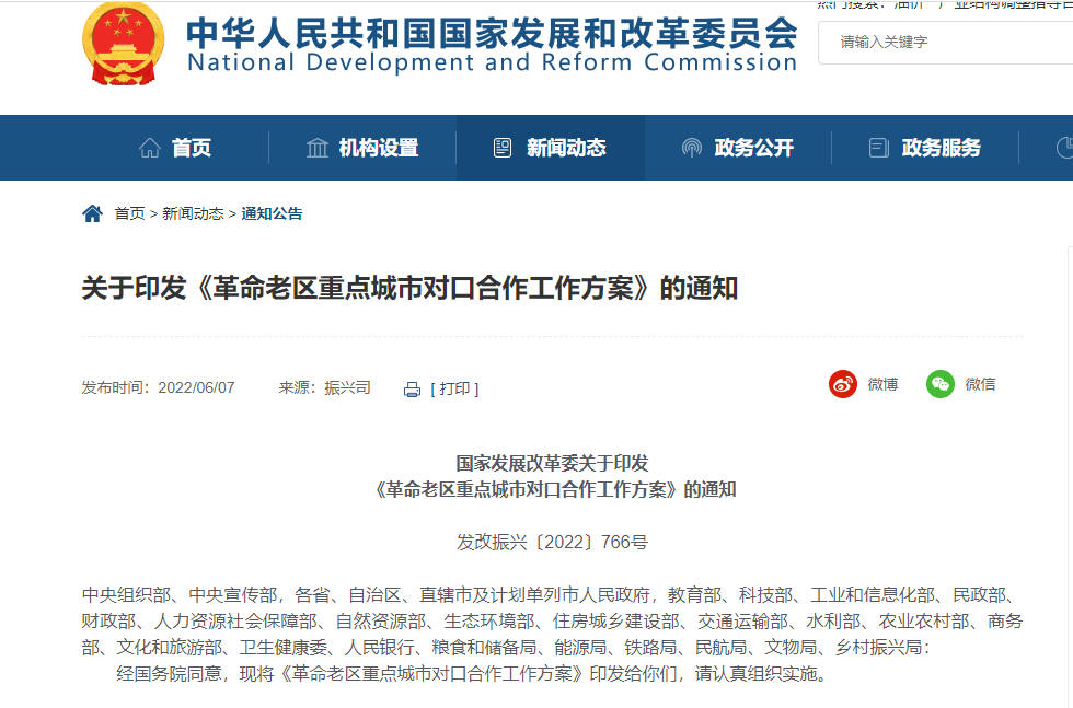 習(xí)近平總書記指出,要認真做好東西部扶貧協(xié)作和對口支援、對口合作工作,助力對口地區(qū)跨越發(fā)展?!秶鴦?wù)院關(guān)于新時代支持革命老區(qū)振興發(fā)展的意見》(國發(fā)〔2021〕3號)明確提出,“研究建立發(fā)達省市與革命老區(qū)重點城市對口合作機制”。《“十四五”特殊類型地區(qū)振興發(fā)展規(guī)劃》進一步指出,要“持續(xù)推動對口支援、對口幫扶、對口協(xié)作、對口合作等工作,強化智力扶持,加強重點領(lǐng)域合作,激發(fā)地區(qū)發(fā)展內(nèi)生動力”。近日,經(jīng)國務(wù)院同意,國家發(fā)展改革委印發(fā)了《革命老區(qū)重點城市對口合作工作方案》(以下簡稱《工作方案》)。這是深入貫徹落實《國務(wù)院關(guān)于新時代支持革命老區(qū)振興發(fā)展的意見》和《“十四五”特殊類型地區(qū)振興發(fā)展規(guī)劃》的具體行動,也是新發(fā)展階段促進區(qū)域協(xié)調(diào)發(fā)展、支持革命老區(qū)振興發(fā)展的創(chuàng)新舉措,將有利于結(jié)對城市優(yōu)勢互補、互學(xué)互鑒、互惠互利、共謀發(fā)展,有利于加強區(qū)域協(xié)作合作,共同穩(wěn)定經(jīng)濟增長。 一、《工作方案》是新發(fā)展階段支持革命老區(qū)振興發(fā)展的創(chuàng)新舉措 黨的十八大以來,中央部委、對口支援省市、中央企業(yè)、科研機構(gòu)、社會各界等齊心協(xié)力支持革命老區(qū)振興發(fā)展,先后出臺了百余個支援革命老區(qū)建設(shè)的政策文件,幫助革命老區(qū)人民脫貧奔小康,充分發(fā)揮社會主義制度優(yōu)勢和延續(xù)我黨集中力量辦大事的優(yōu)良傳統(tǒng),推動革命老區(qū)與全國同步全面建成小康社會,邁上了全面建設(shè)社會主義現(xiàn)代化的新征程。在此背景下,編制和實施《工作方案》,有利于貫徹新發(fā)展理念,發(fā)揮中國特色社會主義制度優(yōu)勢推動共同富裕,構(gòu)建發(fā)達地區(qū)和特殊類型地區(qū)協(xié)同發(fā)展的新局面;有利于發(fā)揮偉大建黨精神的引領(lǐng)作用,激勵革命老區(qū)重點城市和發(fā)達地區(qū)部分城市共同開啟社會主義現(xiàn)代化建設(shè)新征程;有利于統(tǒng)籌區(qū)域協(xié)調(diào)發(fā)展,鞏固革命老區(qū)脫貧攻堅成果銜接推進鄉(xiāng)村振興和新型城鎮(zhèn)化,促進革命老區(qū)重點城市和發(fā)達地區(qū)共謀經(jīng)濟社會發(fā)展,同步構(gòu)建高質(zhì)量發(fā)展新格局。 《工作方案》根據(jù)國務(wù)院批復(fù)的《“十四五”特殊類型地區(qū)振興發(fā)展規(guī)劃》,明確了重點推動贛州、吉安、龍巖、三明、梅州、延安、慶陽、六安、信陽、黃岡、百色、巴中、郴州、張家界、恩施、遵義、長治、汕尾、麗水等20個城市開展對口合作,基于現(xiàn)有東西部協(xié)作、對口合作關(guān)系等,選擇位于粵港澳大灣區(qū)、長三角、京津冀的發(fā)達城市與革命老區(qū)重點城市對口合作。《工作方案》同時明確,支持其他革命老區(qū)市縣主動對接?xùn)|部、中部地區(qū)城市,比照本方案建立對口合作關(guān)系。鼓勵相關(guān)?。▍^(qū)、市)結(jié)合實際建立省域內(nèi)結(jié)對幫扶革命老區(qū)市縣工作機制。 二、立足革命老區(qū)振興發(fā)展定位謀劃五大對口合作重點任務(wù) 《工作方案》以習(xí)近平新時代中國特色社會主義思想為指導(dǎo),緊密圍繞《國務(wù)院關(guān)于新時代支持革命老區(qū)振興發(fā)展的意見》以及《“十四五”特殊類型地區(qū)振興發(fā)展規(guī)劃》中關(guān)于革命老區(qū)振興發(fā)展的重點任務(wù),準(zhǔn)確把握革命老區(qū)振興發(fā)展共性,明確了優(yōu)勢互補、互惠互利、共謀發(fā)展的對口合作工作思路,聚焦促進區(qū)域協(xié)調(diào)發(fā)展、推動區(qū)域合作協(xié)作提出了5大重點任務(wù),進一步豐富了新發(fā)展階段革命老區(qū)振興發(fā)展的實踐路徑。 在促進紅色文化傳承方面,革命老區(qū)是革命傳統(tǒng)的重要承載地,黨史事件多、紅色資源多、革命先輩多,蘊含著中華民族偉大復(fù)興的強大精神力量,鑄就了井岡山精神、蘇區(qū)精神、老區(qū)精神等偉大精神,開展黨史學(xué)習(xí)教育具有獨特優(yōu)勢?!豆ぷ鞣桨浮访鞔_,結(jié)合對口合作,積極支持赴革命老區(qū)重點城市開展學(xué)習(xí)交流,大力弘揚偉大建黨精神,傳承弘揚井岡山精神、蘇區(qū)精神、長征精神、遵義會議精神等偉大精神,鼓勵共同開展革命文物保護利用,共同搭建紅色文化旅游融合發(fā)展平臺。 在銜接推進鄉(xiāng)村振興和新型城鎮(zhèn)化方面,12個革命老區(qū)總?cè)丝诩s2.6億,約占全國的19%?!豆ぷ鞣桨浮访鞔_,結(jié)合對口合作,做好易地扶貧搬遷后續(xù)扶持,加大就業(yè)和產(chǎn)業(yè)扶持力度,推進鄉(xiāng)村振興。持續(xù)加強消費幫扶,推進革命老區(qū)特色農(nóng)產(chǎn)品產(chǎn)銷對接。支持革命老區(qū)重點城市推進以人為核心的新型城鎮(zhèn)化,因地制宜建設(shè)區(qū)域性節(jié)點城市、重要交通樞紐、現(xiàn)代產(chǎn)業(yè)基地、商貿(mào)物流中心等。 在完善基礎(chǔ)設(shè)施和基本公共服務(wù)設(shè)施方面,革命老區(qū)大多位于京津冀、長三角、粵港澳大灣區(qū)、成渝都市圈、長江中游城市群的交通物流通道上