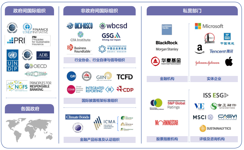 ESG理念和投資原則的迅速傳播和應(yīng)用,關(guān)鍵在于政府間國際組織、非政府間國際組織、公共部門和企業(yè)等多元主體共同參與。聯(lián)合國系統(tǒng)的13家機(jī)構(gòu)或倡議組織(包括UNCTAD、ITC、UNDP、UNEP、WBG、IFC、IMF、UN SSE、UNEP FI、PRI、PSI、PRB、UNGC 等),經(jīng)濟(jì)合作與發(fā)展組織(OECD)、二十國集團(tuán)(G20)等重要的國際多邊合作組織,都積極推動ESG政策的制定實(shí)行,以亞洲開發(fā)銀行(ADB)為代表的各地區(qū)開發(fā)銀行也紛紛加強(qiáng)對可持續(xù)領(lǐng)域的項(xiàng)目投資力度,推動地區(qū)可持續(xù)發(fā)展目標(biāo)的實(shí)現(xiàn)。在各類國際組織、政府監(jiān)管部門、金融機(jī)構(gòu)和實(shí)體企業(yè)等共同推動下,ESG逐漸走向標(biāo)準(zhǔn)化、國際化、體系化、全面化,成為了國際資本市場的一種“新規(guī)則”。