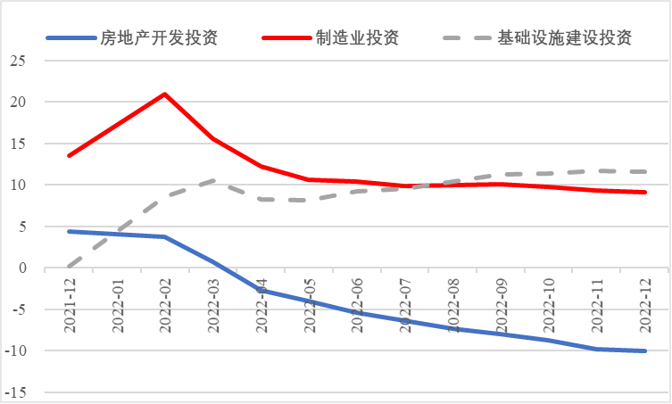 隨著疫情政策的轉變帶來經濟活動復蘇,2023年我國的經濟形勢將顯著好于2022年,在外需轉弱的情況下,我國亟待拉動內需,充分發(fā)揮投資的關鍵作用,保持經濟穩(wěn)定增長。綜合來看,在推動制造業(yè)高端化、智能化、綠色化發(fā)展的政策環(huán)境下,制造業(yè)投資尤其是高技術制造業(yè)投資將保持穩(wěn)步高速增長。能源、交通、水利和新型基礎設施建設仍是基建投資的重點領域,在財政增量工具繼續(xù)支持下,基建投資將依然強勁。隨著針對房地產市場供需兩端的政策不斷優(yōu)化,2023年房地產投資降幅有望收窄,但由于內外部資金依舊承壓,房地產企業(yè)總體處于降杠桿的進程中,房地產開發(fā)投資恢復仍需一定時間。綜上判斷,2023年固定資產投資有望實現持續(xù)平穩(wěn)增長,預計累計同比增速在6%左右。