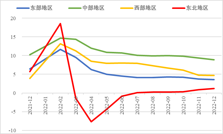 2022年1—12月,東部地區(qū)投資同比增長3.6%,較前三季度、上半年、一季度分別回落0.7個、0.9個、5.9個百分點;中部地區(qū)投資增長8.9%,較前三季度、上半年、一季度分別回落1.1個、1.8個、5.5個百分點;西部地區(qū)投資增長4.7%,較前三季度、上半年、一季度分別回落2個、3.3個、6.6個百分點;東北地區(qū)投資增長1.2%,較前三季度、上半年、一季度分別提升1個、2.1個、2.6個百分點??偟膩砜?,中部和西部地區(qū)投資保持較快增長,東部地區(qū)增速較低,東北地區(qū)投資在上半年負增長的基礎上止跌,呈恢復增長態(tài)勢。