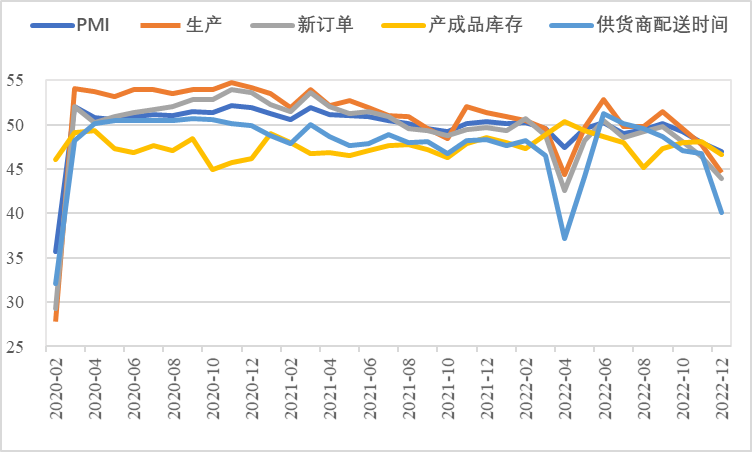 從分類指數構成看,12月制造業(yè)生產指數和新訂單指數為44.6%、43.9%,分別較上月下降3.2個、2.5個百分點,均為2022年5月以來的最低值,制造業(yè)生產和市場需求持續(xù)減少;從業(yè)人員指數為44.8%,較上月下降2.6個百分點,為2020年3月以來的最低水平,制造業(yè)企業(yè)用工景氣度下降;供應商配送時間指數為40.1%,較上月下降6.6個百分點,表明制造業(yè)原材料供應商交貨時間有所延長??偟膩砜?,制造業(yè)供需兩端均不同程度受損,供給沖擊和需求收縮壓力仍然突出,成為制約當前經濟恢復的突出問題。
