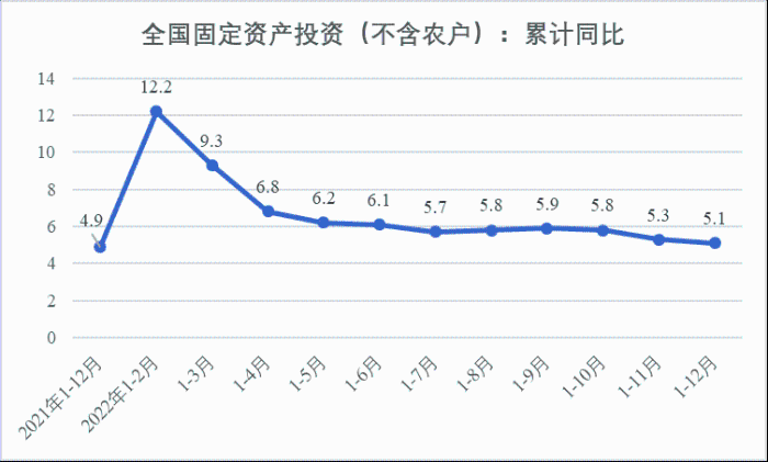 2022年1—12月,我國固定資產投資(不含農戶,下同)572138億元,同比增長5.1%。一季度投資增速達到9.3%的年內高點,上半年、前三季度分別降至6.1%、5.9%,年初投資增速較高的重要原因是2022年專項債部分限額提前下達等系列政策發(fā)揮效果,之后受國外地緣政治沖突、國內疫情多點散發(fā)等因素影響,投資增速有所下降,但降幅逐季收窄。一季度、上半年、前三季度、全年固定資產投資增速分別較同期國內生產總值增速高了4.5個、3.6個、2.9個和2.1個百分點,投資成為當前穩(wěn)定宏觀經濟大盤的關鍵力量。