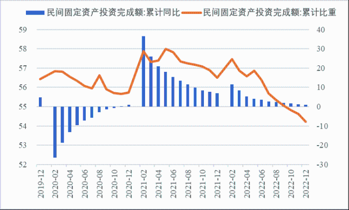 1—12月,我國固定資產投資三年平均增速為4.3%,低于2019年同期1.1個百分點,全面恢復到疫情前水平仍需一定時間。尤其是民間投資受疫情沖擊較為嚴重,復蘇難度較大。一季度、上半年、前三季度、全年民間投資分別同比增長8.4%、3.5%、2%、0.9%,低于整體投資增速0.9個、2.6個、3.9個、4.2個百分點,與整體投資增速的差距逐季拉大。從占比看,截至12月底民間投資累計占固定資產投資的比重已降至54.2%,低于2019年同期2.2個百分點。