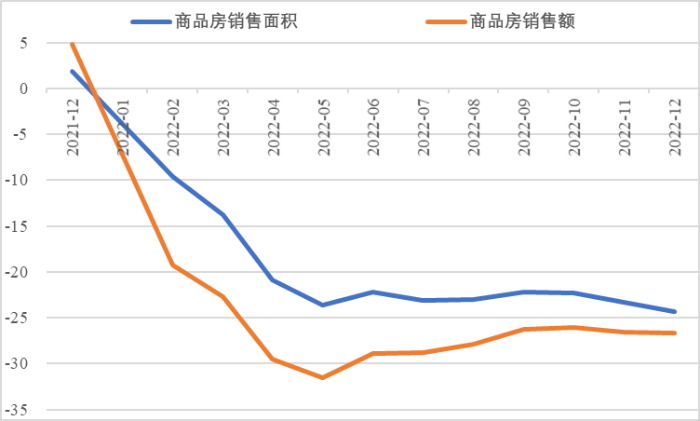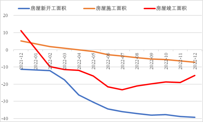 2022年1—12月,房地產投資132895億元,同比下跌10%,其中住宅投資100646億元,下降9.5%。從房企融資數據看,一季度末、二季度末、三季度末、四季度末房地產開發(fā)企業(yè)到位資金分別同比下降19.6%、25.3%、8%、25.9%,四季度增速降幅進一步擴大;1—12月房企資金來源中,國內貸款、自籌資金、定金及預收款、個人按揭貸款分別同比下降25.4%、19.1%、33.3%、26.5%,房企融資能力明顯不足。從房屋開工竣工數據看,1—12月全國房屋新開工面積同比下降39.4%,其中住宅新開工面積下降39.8%,降幅較前三季度進一步擴大。