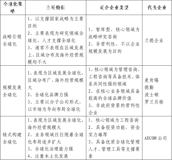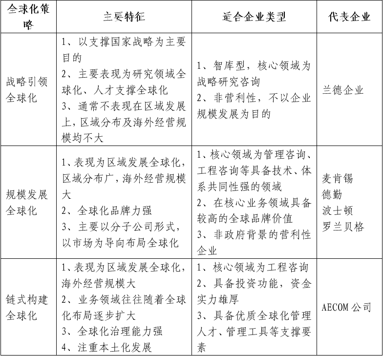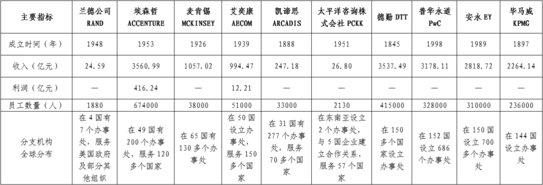 中咨公司與世界一流咨詢企業(yè)對(duì)比研究 中咨公司“青馬工程”第四小組 陳佳鵬 譚瀟 王晶晶 等 一、研究背景 (一)研究目的 黨的二十大報(bào)告提出,要“深化國(guó)資國(guó)企改革,加快國(guó)有經(jīng)濟(jì)布局優(yōu)化和結(jié)構(gòu)調(diào)整,推動(dòng)國(guó)有資本和國(guó)有企業(yè)做強(qiáng)做優(yōu)做大,提升企業(yè)核心競(jìng)爭(zhēng)力”“完善中國(guó)特色現(xiàn)代企業(yè)制度,弘揚(yáng)企業(yè)家精神,加快建設(shè)世界一流企業(yè)”,這些都為國(guó)資國(guó)企以實(shí)際行動(dòng)全面建設(shè)社會(huì)主義現(xiàn)代化國(guó)家、以中國(guó)式現(xiàn)代化推進(jìn)中華民族偉大復(fù)興提供了根本遵循。 《國(guó)企改革三年行動(dòng)方案(2020-2022年)》和《關(guān)于開(kāi)展對(duì)標(biāo)世界一流管理提升行動(dòng)的通知》(國(guó)資發(fā)改革〔2020〕39號(hào)),要求中央企業(yè)要對(duì)標(biāo)世界一流企業(yè),通過(guò)管理提升,建設(shè)成為具有全球競(jìng)爭(zhēng)力的企業(yè)。中國(guó)國(guó)際工程咨詢有限公司(以下簡(jiǎn)稱(chēng)中咨公司)“十四五”規(guī)劃明確提出,未來(lái)發(fā)展要聚焦于實(shí)現(xiàn)建成國(guó)家高端智庫(kù)和世界一流咨詢機(jī)構(gòu)的戰(zhàn)略目標(biāo),指明了公司的前進(jìn)方向。 為深入貫徹黨的二十大報(bào)告關(guān)于國(guó)資國(guó)企改革發(fā)展和黨的建設(shè)的重大部署,認(rèn)真落實(shí)國(guó)務(wù)院國(guó)資委關(guān)于中央企業(yè)對(duì)標(biāo)世界一流管理提升改革行動(dòng)計(jì)劃的相關(guān)部署和中咨公司“十四五”發(fā)展規(guī)劃,以推動(dòng)公司高質(zhì)量發(fā)展為主題,以改革創(chuàng)新為根本動(dòng)力,緊扣“加快建設(shè)世界一流咨詢機(jī)構(gòu)”目標(biāo),通過(guò)選取咨詢領(lǐng)域有較強(qiáng)影響力的標(biāo)桿企業(yè)開(kāi)展對(duì)比研究,提出中咨公司建設(shè)世界一流咨詢機(jī)構(gòu)的戰(zhàn)略構(gòu)想,進(jìn)一步搶抓高質(zhì)量發(fā)展的重要戰(zhàn)略機(jī)遇期。 (二)對(duì)比范圍 基于中咨公司業(yè)務(wù)范圍與自身戰(zhàn)略規(guī)劃,本次研究將重點(diǎn)選取全球領(lǐng)先的智庫(kù)型企業(yè)、管理咨詢企業(yè)、工程咨詢企業(yè)進(jìn)行對(duì)比研究。 表1 三類(lèi)咨詢企業(yè)分類(lèi)一覽表 (三)研究思路 重點(diǎn)圍繞經(jīng)營(yíng)規(guī)模、全球戰(zhàn)略布局、集團(tuán)化發(fā)展、數(shù)字化發(fā)展、人才培養(yǎng)等方面開(kāi)展對(duì)比研究,為中咨公司打造世界一流咨詢機(jī)構(gòu)提出初步的方向性戰(zhàn)略構(gòu)想,更好地服務(wù)公司高質(zhì)量發(fā)展總體戰(zhàn)略。充分發(fā)揮龍頭示范作用,加強(qiáng)精細(xì)化管理,全面提升核心競(jìng)爭(zhēng)力,助力中咨公司加快建設(shè)成為國(guó)內(nèi)有權(quán)威、國(guó)際有影響的國(guó)家高端智庫(kù)、世界一流咨詢機(jī)構(gòu),體現(xiàn)智庫(kù)型中央企業(yè)的使命擔(dān)當(dāng)。 二、經(jīng)營(yíng)規(guī)模現(xiàn)狀分析 (一)對(duì)比企業(yè)經(jīng)營(yíng)規(guī)模情況 1.智庫(kù)型企業(yè) 蘭德公司(RAND)是全球頂級(jí)智庫(kù)型企業(yè)之一。蘭德公司成立于1948年,總部設(shè)在美國(guó)加利福尼亞州的圣莫尼卡,是國(guó)際最知名的非營(yíng)利性的研究機(jī)構(gòu)之一,被譽(yù)為現(xiàn)代智囊的“大腦集中營(yíng)”“超級(jí)軍事學(xué)院”,致力于以嚴(yán)謹(jǐn)?shù)姆治鲅芯縼?lái)推進(jìn)決策與政策制定。擁有來(lái)自50多個(gè)國(guó)家的1880多名員工,半數(shù)以上的研究人員持有一個(gè)或多個(gè)博士學(xué)位,在2020年全球頂級(jí)智庫(kù)綜合榜單中排名第七,2021年總收入為24.59億元(折人民幣)。 業(yè)務(wù)領(lǐng)域范圍較廣。蘭德公司資金來(lái)源廣泛,目前軍隊(duì)、政府的資助仍然超過(guò)一半以上。蘭德公司主要為美國(guó)軍方、美國(guó)政府機(jī)構(gòu)、基金會(huì)、高校以及私營(yíng)企業(yè)等提供咨詢服務(wù),研究領(lǐng)域主要涉及軍事科技、國(guó)家安全、國(guó)際事務(wù)、公共安全、法律與商業(yè)、教育、健康、基礎(chǔ)設(shè)施、交通、能源、環(huán)境、網(wǎng)絡(luò)通訊、數(shù)據(jù)科學(xué)、社會(huì)公平等。 2.管理咨詢企業(yè) 埃森哲(ACCENTURE)。埃森哲成立于1953年,是一家全球領(lǐng)先的專(zhuān)業(yè)服務(wù)公司,在數(shù)字化、云計(jì)算與網(wǎng)絡(luò)安全領(lǐng)域擁有全球領(lǐng)先的能力。埃森哲秉承“科技融靈智,匠心承未來(lái)”的企業(yè)使命,致力于通過(guò)引領(lǐng)變革創(chuàng)造價(jià)值,為客戶、員工、股東、合作伙伴與整個(gè)社會(huì)創(chuàng)造美好未來(lái)。埃森哲憑借獨(dú)特的業(yè)內(nèi)經(jīng)驗(yàn)與專(zhuān)業(yè)技能,以及翹楚全球的卓越技術(shù)中心和智能運(yùn)營(yíng)中心,為客戶提供戰(zhàn)略和咨詢、互動(dòng)體驗(yàn)、技術(shù)服務(wù)和智能運(yùn)營(yíng)等全方位服務(wù),業(yè)務(wù)涵蓋40多個(gè)行業(yè),以及企業(yè)日常運(yùn)營(yíng)部門(mén)的各個(gè)職能。埃森哲是《財(cái)富》全球500強(qiáng)企業(yè)之一,在全球49個(gè)國(guó)家設(shè