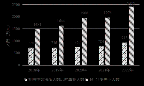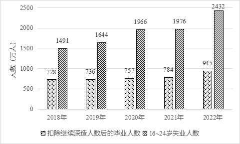 (二)供需錯配進一步加劇失業(yè)風險。一是部分行業(yè)用人需求出現(xiàn)萎縮。根據(jù)普查數(shù)據(jù),有近50%的青年人就業(yè)主要集中在制造業(yè)、批發(fā)零售、住宿餐飲等行業(yè),但是近年來受疫情沖擊,居民消費需求恢復緩慢,住宿餐飲等服務行業(yè)收縮明顯,同時勞動密集型制造業(yè)與低端制造外遷,致使其吸納就業(yè)能力下降,對青年群體尤其是低學歷青年就業(yè)形成拖累。二是畢業(yè)生供給持續(xù)創(chuàng)新高。每年高校畢業(yè)生人數(shù)都在持續(xù)遞增,2023年高校畢業(yè)生已經(jīng)達到1158萬人,比本世紀初高出十倍之多,剔除考公、考研、出國的人數(shù),預估仍將有950萬應屆生進入職場,激烈程度每年只增不減。再加上近年外國留學人員回國求職人數(shù)上升,進一步增加了青年求職群體的就業(yè)壓力。三是結(jié)構(gòu)性矛盾突出。一方面,青年學生就業(yè)觀不實際。很多畢業(yè)生對就業(yè)環(huán)境、行業(yè)、城市的期望與實際勞動力市場提供的條件存有落差,青年不再愿意入職傳統(tǒng)的制造業(yè)工廠,甚至出現(xiàn)“3000元工廠招不到藍領(lǐng)工人,寫字樓卻可以招到大學生”的說法。并且近年來越來越多畢業(yè)生競爭有限的公職崗位,耽誤了最佳的就業(yè)時機。另一方面,知識和能力跟不上需求。在信息密集型服務業(yè)、知識密集型服務業(yè)等領(lǐng)域,眾多低學歷青年的知識儲備和能力無法滿足企業(yè)要求。此外,當前高校的教育與社會需求脫節(jié),導致人才培養(yǎng)滯后于產(chǎn)業(yè)結(jié)構(gòu)調(diào)整和市場需求變化。