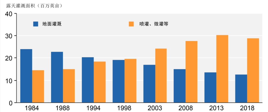 同時(shí),美國(guó)越來(lái)越注重高效節(jié)水灌溉技術(shù)的運(yùn)用。美國(guó)農(nóng)業(yè)灌溉主要集中在西部17州。1984年美國(guó)西部17州露天灌溉農(nóng)田中使用高效節(jié)水灌溉系統(tǒng)的比重為37%,2018年該比例提高至72%,見圖9。