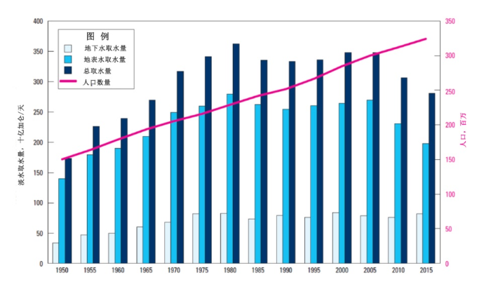 圖2 1950-2015年美國(guó)淡水取用水量與人口變化態(tài)勢(shì)
