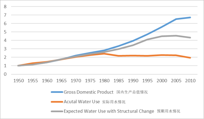 有研究[3]繪制了以1950年為基準(zhǔn),至2010年美國(guó)GDP與用水量間的關(guān)系變化情況圖(見圖3)。藍(lán)色線為實(shí)際GDP變化,橙色線為實(shí)際用水量變化,灰色線為考慮產(chǎn)業(yè)結(jié)構(gòu)變化、不考慮技術(shù)改進(jìn)情況下的預(yù)測(cè)用水變化。藍(lán)色線與橙色線的剪刀走向表明:早在1980年,美國(guó)用水量已與GDP脫鉤。藍(lán)色線與灰色線、灰色線與橙色線的剪刀走向表明:導(dǎo)致脫鉤的重要因素是用水效率提升和經(jīng)濟(jì)結(jié)構(gòu)變化。