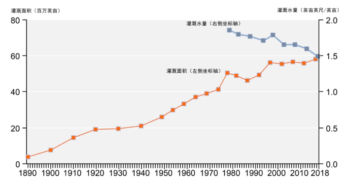 圖7 1890-2018年美國(guó)灌溉面積和單位面積灌溉用水量變化態(tài)勢(shì)