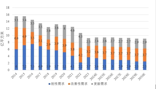 房地產(chǎn)是宏觀經(jīng)濟(jì)研究的重要領(lǐng)域,深入研判房地產(chǎn)發(fā)展歷史、走勢和相關(guān)因素,在當(dāng)前具有很強(qiáng)的現(xiàn)實意義。本文《“以時間換空間”,房地產(chǎn)進(jìn)入平臺探底期》是房地產(chǎn)系列研究之一,研究認(rèn)為,當(dāng)前我國房地產(chǎn)市場發(fā)展進(jìn)入新平臺期,新增商品房需求將呈現(xiàn)“L”型回落趨勢,主流房企正在探索房地產(chǎn)發(fā)展新模式,地產(chǎn)潛在衍生風(fēng)險需持續(xù)監(jiān)測,未來政策仍以時間換空間,政策工具箱將適時打開。 01 我國房地產(chǎn)進(jìn)入第五階段:尋找新的平臺期 第一階段:1998—2007年,地產(chǎn)發(fā)展的黃金十年,消費需求驅(qū)動的商品房市場化階段,房地產(chǎn)投資平均增速24%,商品房銷售面積平均增速20%,行業(yè)毛利潤率平均水平31%,2008年的居民杠桿率18.5%。 第二階段:2008—2016年,地產(chǎn)發(fā)展的白銀十年,投資需求驅(qū)動房地產(chǎn)市場穩(wěn)定發(fā)展期,居民大幅加杠桿,房地產(chǎn)投資平均增速下降至18.5%,商品房銷售面積平均增速下降至9.4%,行業(yè)毛利潤率下降至27%,居民杠桿率上升至42.7%,企業(yè)進(jìn)入金融驅(qū)動的高周轉(zhuǎn)模式。 第三階段:2017—2021年,房住不炒政策驅(qū)動的結(jié)構(gòu)性分化期,房地產(chǎn)投資平均增速下降至8.1%,商品房銷售面積的規(guī)模穩(wěn)定在17億平方米,增速趨緩,但城市間的分化和周期輪動明顯加快,三、四線城市趨冷,一、二線窄幅波動。 第四階段:2021年7月—2024年5月,去杠桿政策驅(qū)動加速下滑期,開啟了房地產(chǎn)“去金融化”進(jìn)程,商品住宅銷售面積從15.7億平方米下降至9.5億平方米,房價全面下降,居民杠桿率達(dá)到64.12%。 第五階段:2024年5月開始進(jìn)入尋找新的平臺期階段,“517政策”后,一系列房地產(chǎn)政策出臺表明政策轉(zhuǎn)向態(tài)度明確,其目標(biāo)是落實守住不發(fā)生系統(tǒng)性風(fēng)險底線,但不會重走“漲價去庫存”的老路。2024年6月以來,房地產(chǎn)行業(yè)雖持續(xù)處于深度調(diào)整過程中,但主要行業(yè)指標(biāo)跌幅有所收窄,2024年上半年房地產(chǎn)開發(fā)投資同比下降10.1%,但二季度房地產(chǎn)開發(fā)投資較一季度增加37.9%,較去年同期減少6.5%,這表明季度內(nèi)開發(fā)投資雖同比持續(xù)下跌,但跌幅低位趨穩(wěn);房屋新開工規(guī)模仍處歷史低位,同比跌幅逐月收窄,二季度新開工面積20740萬平方米,較上季度增加20.0%,同比減少19.5%;二季度,全國商品房銷售面積25248萬平方米,較上季度增加11.4%,同比減少14.6%,商品房銷售金額25778億元,較上季度增加22.7%,同比減少20.8%,新建商品房銷售面積及金額同比跌幅較上季度末有所收窄;國房景氣指數(shù)從一季度末的92.07回調(diào)至92.11。 圖1 我國房地產(chǎn)開發(fā)投資完成情況 (單位:億元,%) 02 我國新增商品房需求將呈現(xiàn)“L”型回落趨勢,預(yù)計年均新增需求中樞約為9.3億平方米,需求增速中樞為-3.6%,投資增速中樞為-1.4% 從房地產(chǎn)銷售的預(yù)測框架來看,商品房兩大屬性=居住+投資。在全面去金融化趨勢下,假設(shè)投資需求為0,則新建商品房需求=新增剛性需求(適齡購房人口+城鎮(zhèn)化率)+新增改善需求(人均居住面積)+新增更新需求(舊改、棚改)-存量房供給-新建保障性住房,人口負(fù)增長、城鎮(zhèn)化率增速放緩、人均住房面積提升帶來剛性(2.9億平方米/年)和改善需求(3.7億平方米/年)下降,但舊房更新需求(2.7億平方米/年)和新建保障性住房增加,帶來新增商品房需求逐年回落,但斜率趨緩??傮w來看,我國新型城鎮(zhèn)化仍在持續(xù)推進(jìn),房地產(chǎn)高質(zhì)量發(fā)展還有相當(dāng)大的空間。 圖2 我國住房總需求及其構(gòu)成的預(yù)測 (單位:億平方米) 注:根據(jù)任澤平研究團(tuán)隊《中國住房需求測算2024》模型修正估算。 03 目前房地產(chǎn)行業(yè)基本面仍處于下行階段,供需兩端下行趨勢仍然嚴(yán)峻,但市場出現(xiàn)了“筑底”信號 2024年上半年,房地產(chǎn)行業(yè)基本面仍處于下行階段,但得益于短期從中央到地方利好新政刺激,銷售面積、金額同比降幅略有收窄,新開工、竣工止跌企穩(wěn),6月市場開始出現(xiàn)“筑底”信號,但這不是拐點信號,市場仍處于下行階段。2024年1-6月,全國商品房銷售面積4.79億平米,同比下降19.0%;商品房銷售額4.71萬億元,同比下降25.0%;從6月單月數(shù)據(jù)來看,商品房銷售面積為1.13億平方米,環(huán)比上漲52.5%;商品房銷售額為1.15萬億元,環(huán)比上漲50.9%。截至2024年6月末,商品房待售面積73894萬平方米,同比增長15.2%,其中,住宅待售面積增長23.5%,庫存壓力嚴(yán)峻。1-6月,中指355城住宅土地成交面積和金額分別同比下降38.1%和44.3%;房屋新開工面積3.80億平方米,同比下降23.7%;房屋竣工面積2.65億平方米,同比下降21.8%。本輪房地產(chǎn)去庫存面臨更大壓力,去化周期2024年6月已達(dá)到23.8個月。房價深度調(diào)整,截至2024年6月連續(xù)26個月負(fù)增長,根據(jù)中原領(lǐng)先指數(shù)可知,目前一線城市二手房房價平均降幅達(dá)25%。國家金融監(jiān)管總局?jǐn)?shù)據(jù)顯示,今年5月份首套房貸平均利率3.45%,二套房貸平均利率3.9%,分別比上年同期下降0.55和1個百分點,達(dá)到2008年以來的最低值。 圖3 我國商