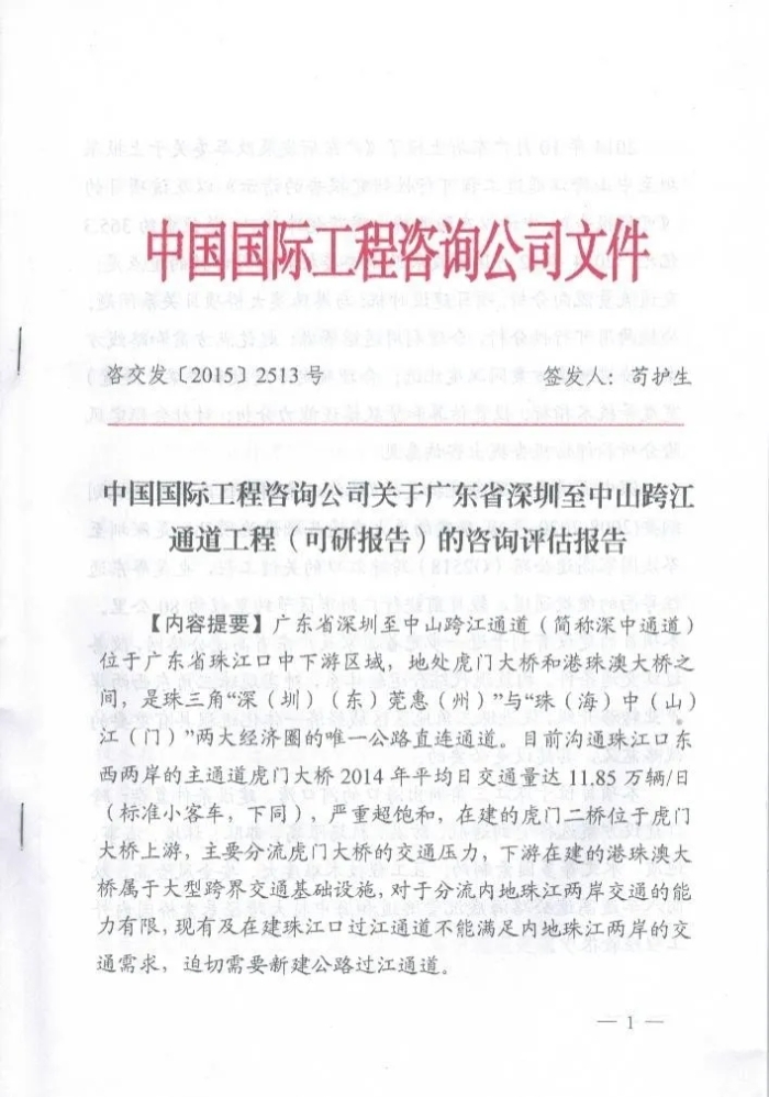 2015年11月,經(jīng)過評(píng)估組研究并進(jìn)行再次評(píng)估后,中咨公司關(guān)于廣東省深圳至中山跨江通道工程(可研報(bào)告)的咨詢?cè)u(píng)估報(bào)告正式提交國(guó)家發(fā)展改革委。