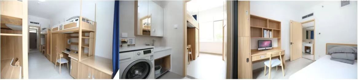 每間公寓均采用上鋪下居的雙層家具,每?jī)蓚€(gè)居室共用一個(gè)小廳,供同學(xué)們交流。宿舍公共區(qū)域每層設(shè)置四個(gè)衛(wèi)生間、淋浴間和盥洗室,不同樓層盥洗室內(nèi)還分布有洗衣機(jī)、直飲水機(jī)等。每層樓設(shè)有數(shù)量不等的大型活動(dòng)室以及學(xué)生工作人員工作與生活用房,便于學(xué)生就近組織班會(huì)及黨、團(tuán)支部組織生活等活動(dòng)。公寓內(nèi)配備紫荊園和桃李園兩座現(xiàn)代化學(xué)生餐廳。