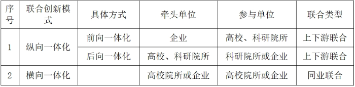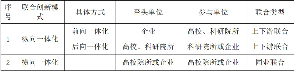 聯(lián)合方式可分為縱向一體化和橫向一體化??v向一體化又包括前向一體化與后向一體化,前者以龍頭企業(yè)為主導(dǎo),向創(chuàng)新鏈前端延伸吸納高校院所參加;后者則以高校院所為主體,向創(chuàng)新鏈下游貫通吸收企業(yè)參與。
